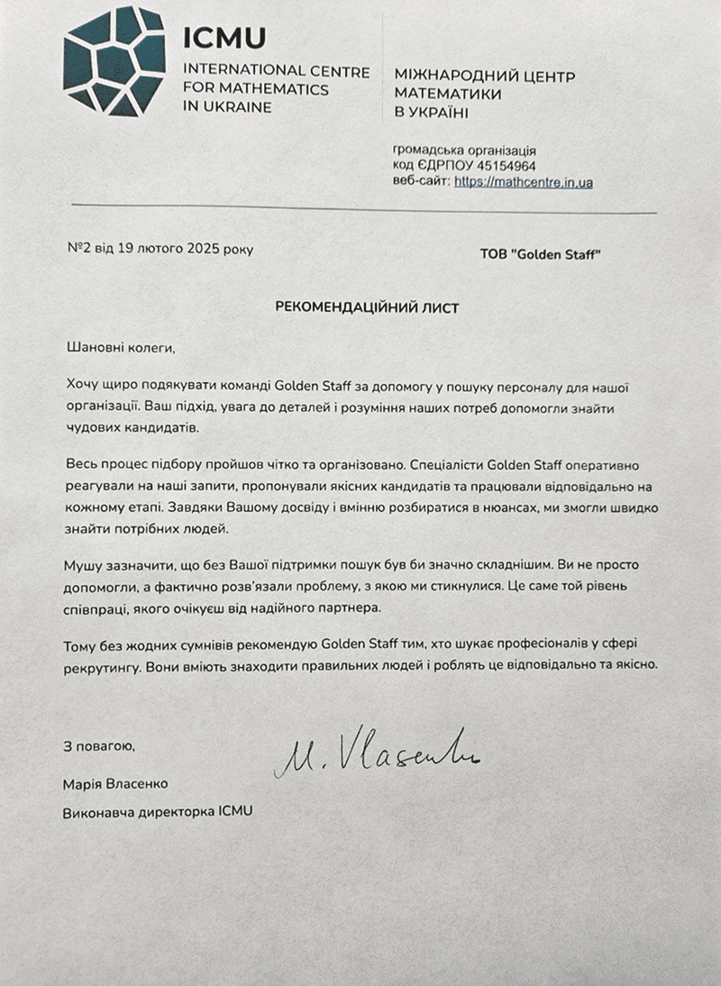 Хочу поблагодарить команду Golden Staff за помощь в поиске персонала для нашей организации. Ваш подход, внимание к деталям и понимание наших потребностей помогли найти отличных кандидатов.