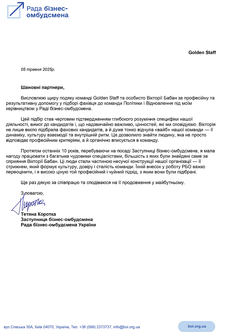 Выражаю искреннюю благодарность команде Golden Staff и лично Виктории Бабан за профессиональную и результативную помощь в подборе специалиста в команду Политики и Восстановление под моим руководством в Совете бизнес-омбудсмена. Этот подбор стал очередным подтверждением глубокого понимания специфики нашей деятельности, требований к кандидатам и, что немаловажно, исповедуемых ценностей.