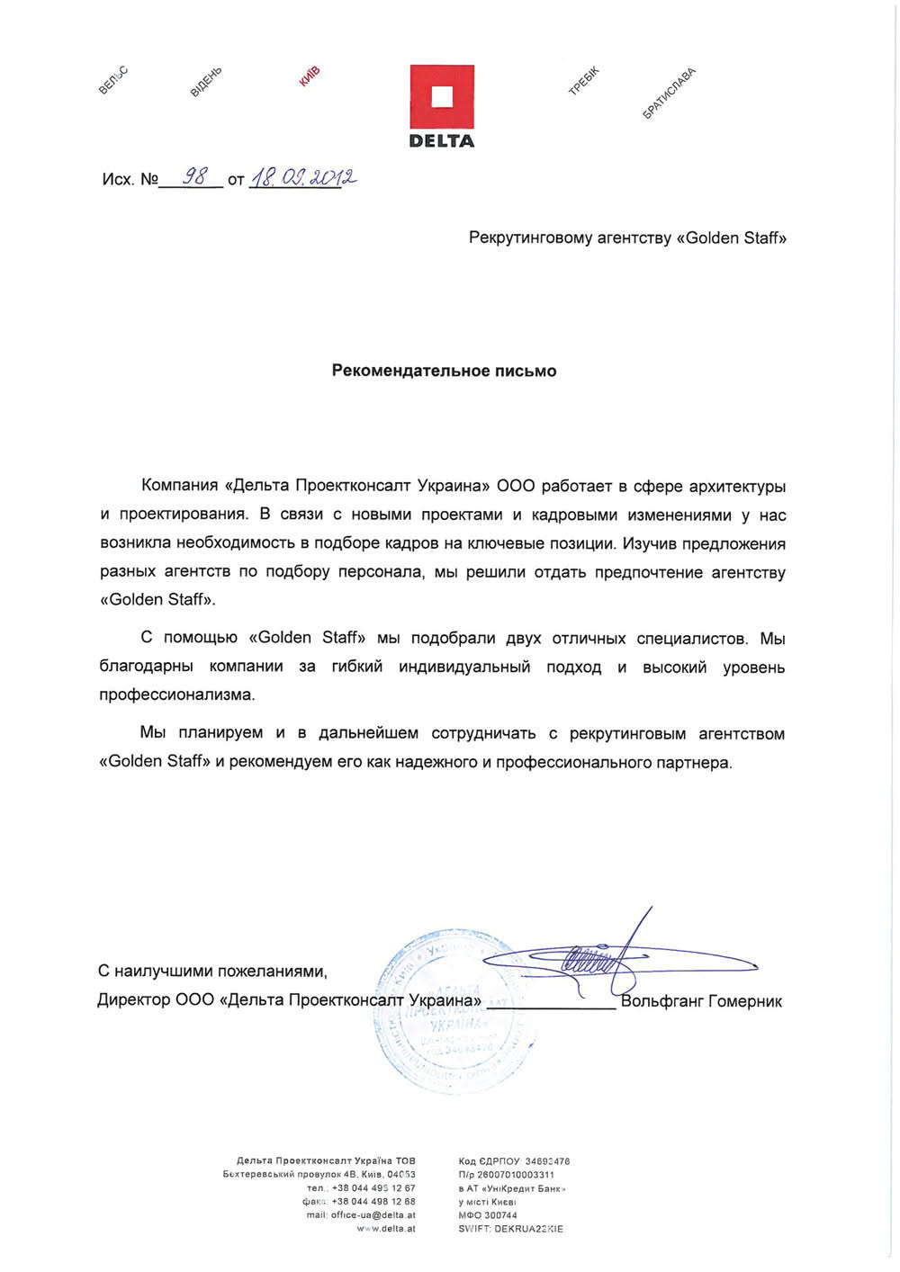 ТОВ «Дельта Проектконсалт Україна»За допомогою "GOLDEN STAFF" ми підібрали двох відмінних фахівців. Ми вдячні компанії за гнучкий індивідуальний підхід та високий рівень професіоналізму. Ми плануємо й надалі співпрацювати з рекрутинговим агентством «GOLDEN STAFF» та рекомендуємо його як надійного та професійного партнера.