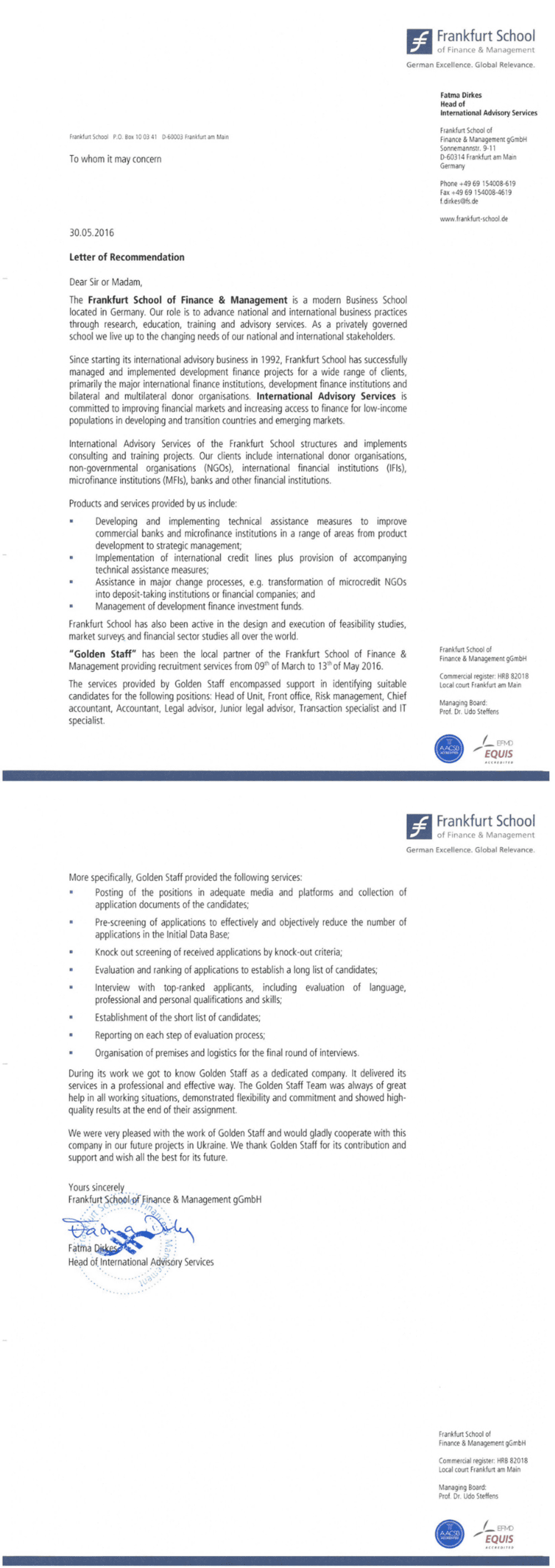 Frankfurt School of Finance & Management"Golden Staff", has been the local partner of the Frankfurt School of Finance & Management providing recruitment services from 09" of March to 13* of May 2016. The services provided by Golden Staff encompassed support in identifying suitable candidates for the following positions: Head of Unit, Front office, Risk management, Chief accountant, Accountant, Legal advisor, Junior legal advisor, Transaction specialist and IT specialist.