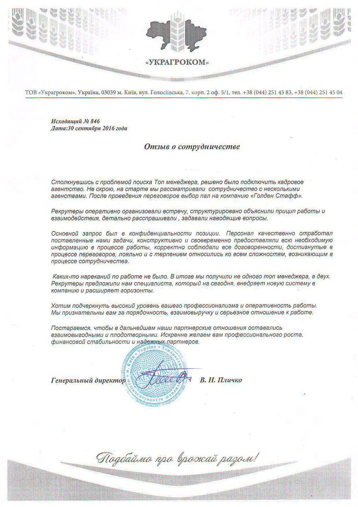 ТОВ «Украгроком»Для пошуку Топ-менеджера компанія «Украгроком» звернулася до агентства «Голден Стафф». Основний запит був у конфіденційності позиції. Рекрутери якісно відпрацювали поставлені завдання, конструктивно, надавали своєчасно необхідну інформацію. У результаті ми здобули не одного топ менеджера, а двох. Хочемо підкреслити високий рівень вашого професіоналізму та оперативність роботи. Ми вдячні вам