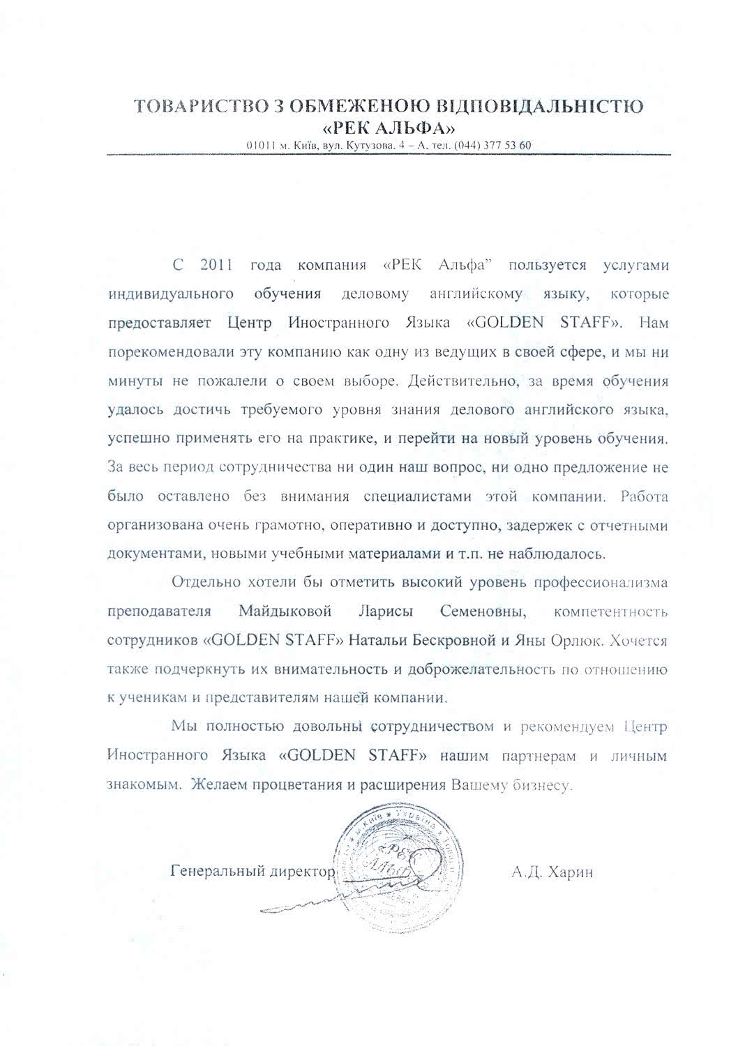 ТОВ «РЕК Альфа»Нам порекомендували цю компанію як одну з провідних у своїй сфері, і ми жодної хвилини не пошкодували про свій вибір. Дійсно, за час навчання вдалося досягти необхідного рівня знання ділової англійської мови, успішно застосовувати її на практиці, та перейти на новий рівень навчання.