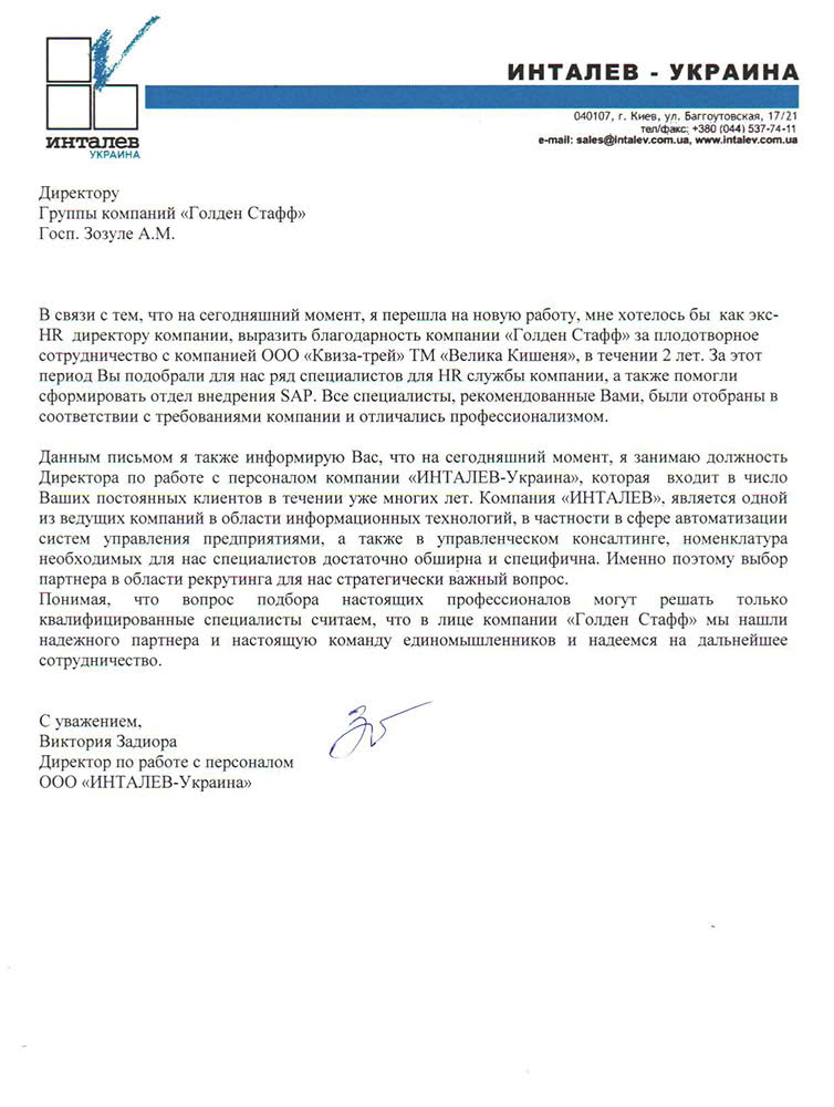 ТОВ «ІНТАЛЄВ-Україна»Розуміючи, що питання підбору справжніх професіоналів можуть вирішити лише кваліфіковані фахівці, вважаємо, що в особі компанії «Голден Стафф» ми знайшли надійного партнера та справжню команду однодумців та сподіваємось на подальшу співпрацю.