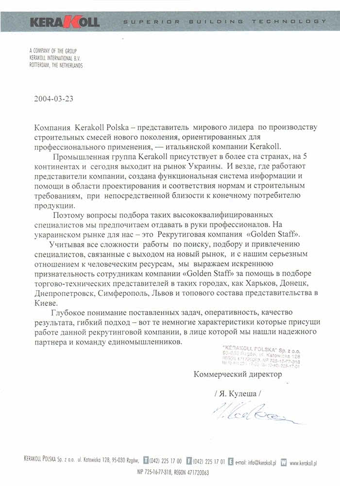 Компанія Kerakoll PolskaВраховуючи всі складності роботи з пошуку, підбору та залучення фахівців, пов'язані з виходом на новий ринок, та з нашим серйозним ставленням до людських ресурсів, ми висловлюємо щиру вдячність співробітникам компанії Golden Staff за допомогу у підборі торгово-технічних представників у таких містах, як Харків, Донецьк, Дніпропетровськ, Сімферополь, Львів та топового складу представництва в Києві.