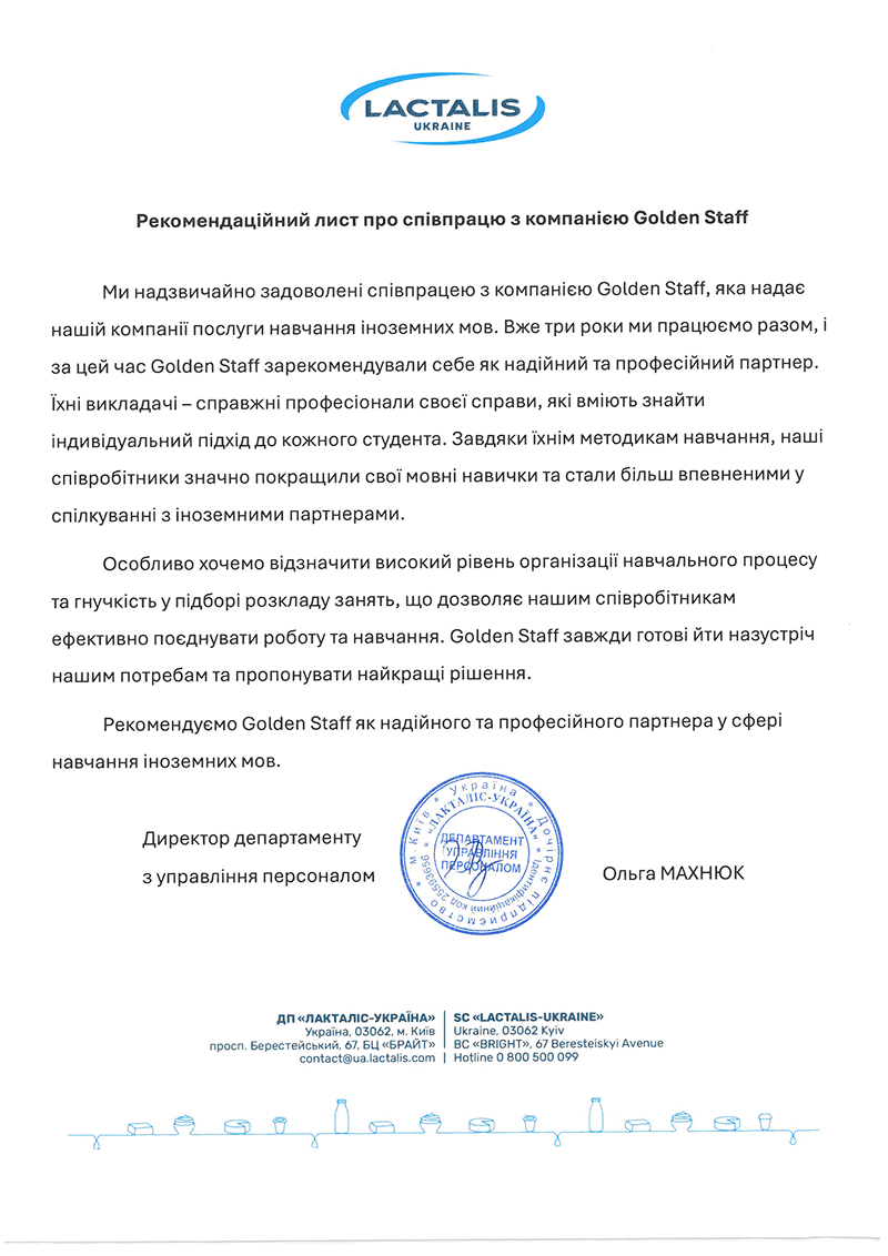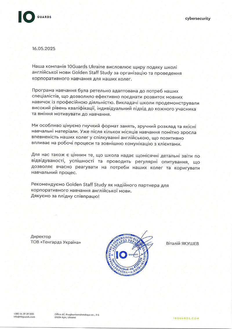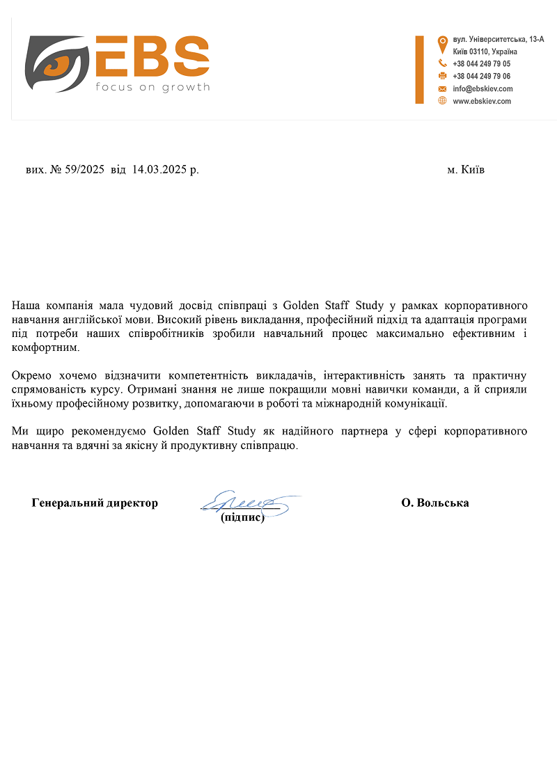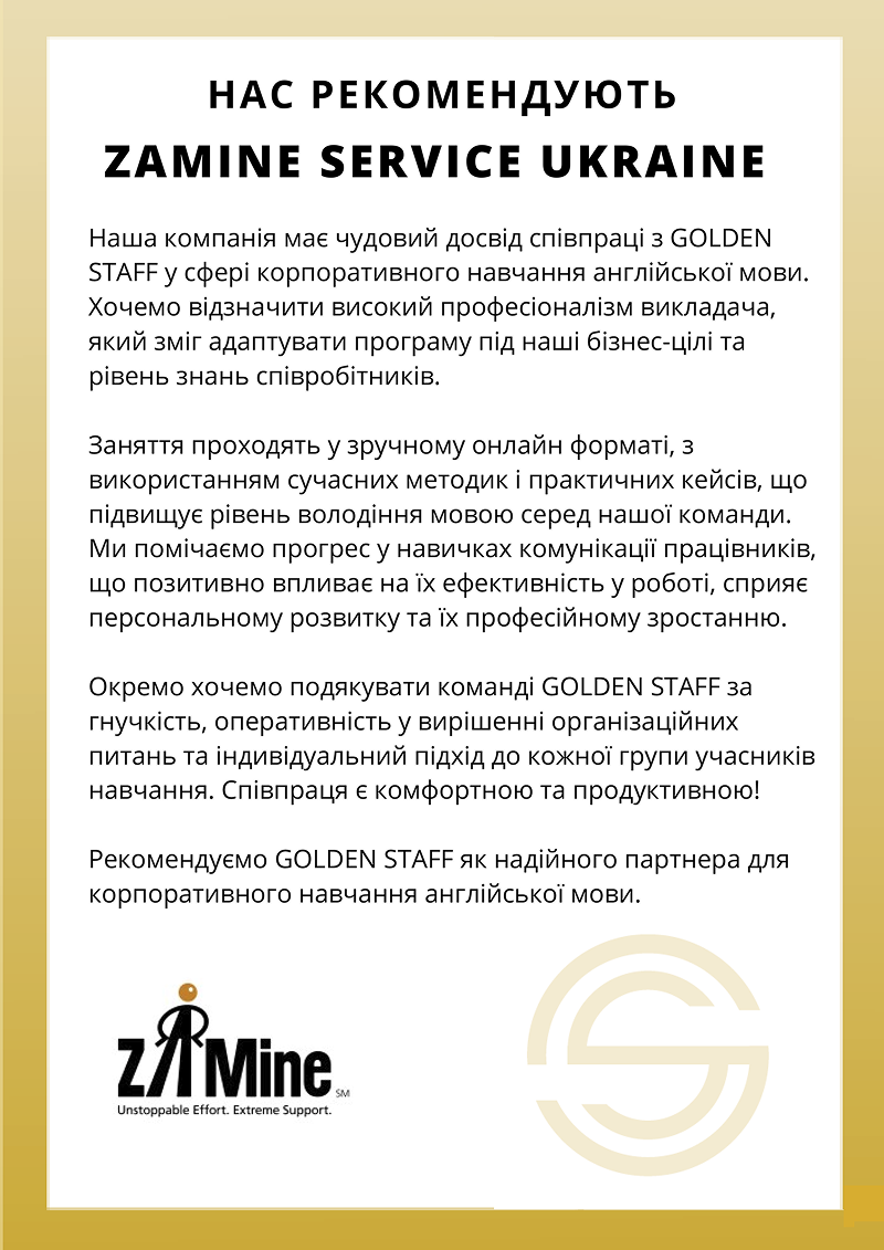Наша компанія має чудовий досвід співпраці з GOLDEN STAFF у сфері корпоративного навчання англійської мови. Хочемо відзначити високий професіоналізм викладача, який зміг адаптувати програму під наші бізнес-цілі та рівень знань співробітників.