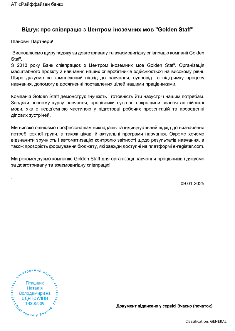 Висловлюємо щиру подяку за довготривалу та взаємовигідну співпрацю компанії Golden Staff. З 2013 року Банк співпрацює з Центром іноземних мов Golden Staff. Організація масштабного проєкту з навчання наших співробітників здійснюється на високому рівні. Щиро дякуємо за комплексний підхід до навчання, супровід та підтримку процесу навчання, допомогу в досягненні поставлених цілей нашими працівниками.