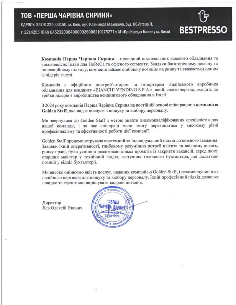 Хочу щиро подякувати команді Golden Staff за допомогу у пошуку персоналу для нашої організації. Ваш підхід, увага до деталей і розуміння наших потреб допомогли знайти чудових кандидатів.