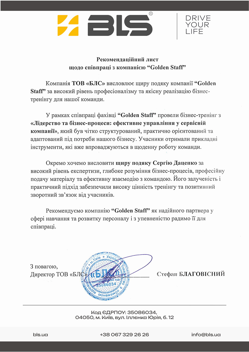 Компанія ТОВ «БЛС» висловлює щиру подяку компанії "Golden Staff' за високий рівень професіоналізму та якісну реалізацію бізнес-тренінгу для нашої команди. Тренінг був чітко структурований, практично орієнтований та адаптований під потреби нашого бізнесу. Учасники отримали прикладні інструменти, які вже впроваджуються в щоденну роботу команди. Окремо хочемо висловити щиру подяку Сергію Даценко за високий рівень експертизи, глибоке розуміння бізнес-процесів, професійну подачу матеріалу та ефективну взаємодію з командою.