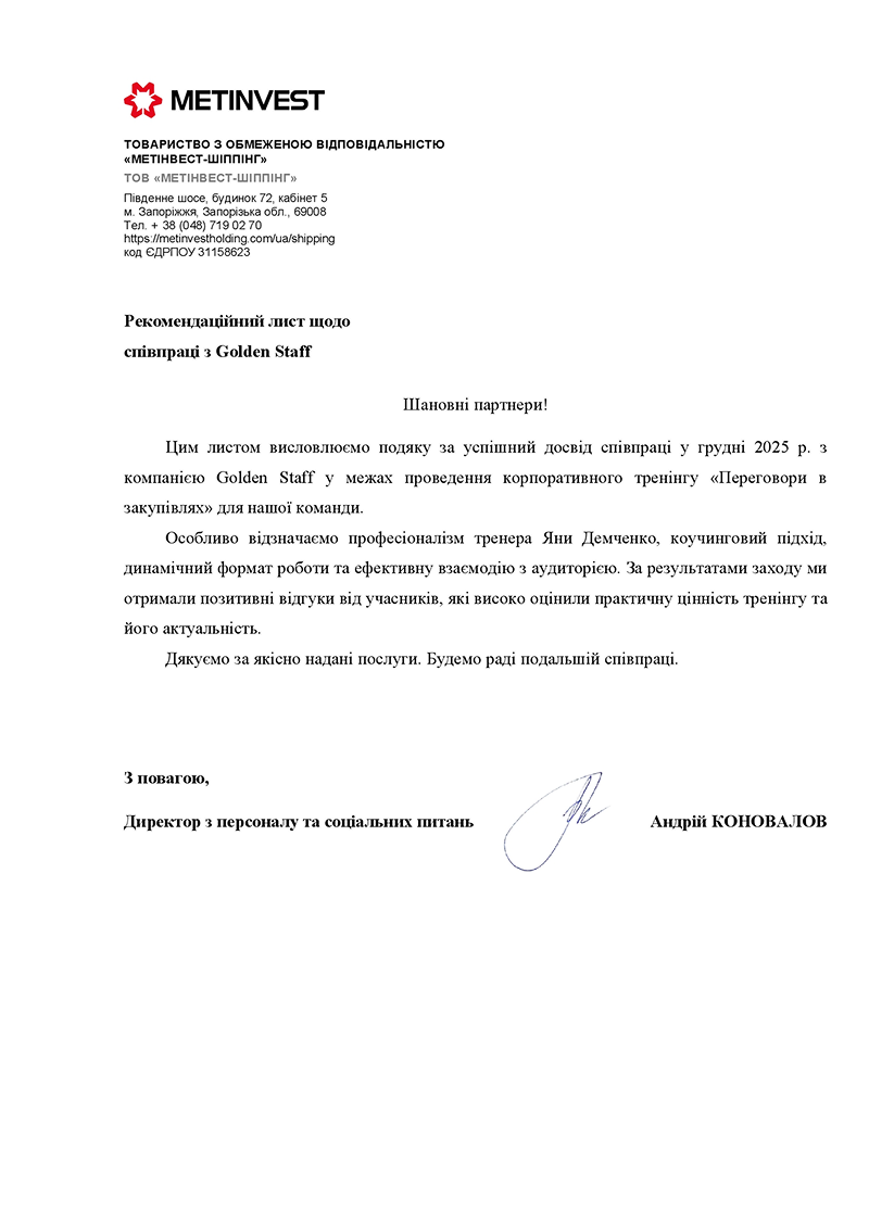 Висловлюємо подяку за успішний досвід у межах проведення корпоративного тренінгу "Переговори в закупівлях" для нашої компанії. Особливо відзначаємо професіоналізм тренера Яни Демченко, коучинговий підхід, динамічний формат роботи та ефективну взаємодію з аудиторією. За результатами заходу ми отримали позитивні відгуки від учасників, які високо оцінили практичну цінність тренінгу та його актуальність.