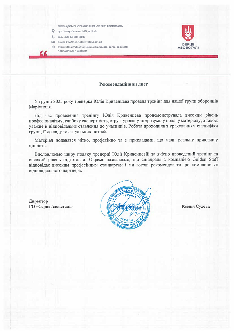 Висловлюємо щиру подяку тренерці Юлії Кривенцевій, яка провела тренінг для нашої групи оборонців Маріуполя. Під час тренінгу Юлія Кривенцева продемонструвала високий рівень професіоналізму, глибоку експертність, структуровану та зрозумілу подачу матеріалу, а також уважне й відповідальне ставлення до учасників. Робота проходила з урахуванням специфіки групи, її досвіду та актуальних потреб. Матеріал подавався чітко, професійно та з прикладами, що мали реальну прикладну цінність.